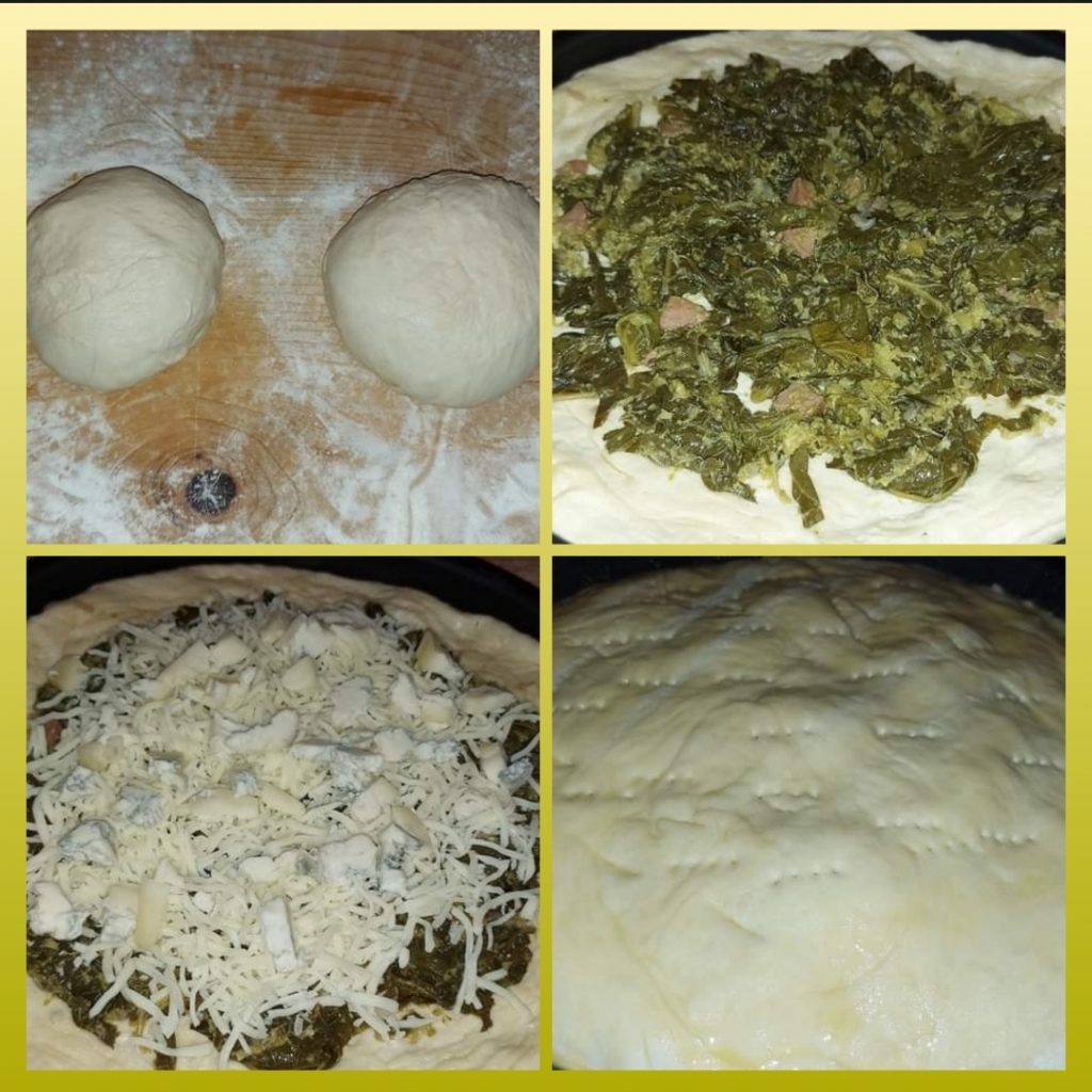 Dopo 5 ore di lievitazione dividere in 2 parti l’impasto e lasciar lievitare un’altra ora. Ora stendete i due panetti e inseritene uno nel tegame oleato. Aggiungete le rape stufate, la mozzarella sgocciolata, il gongorzola ed il prosciutto.